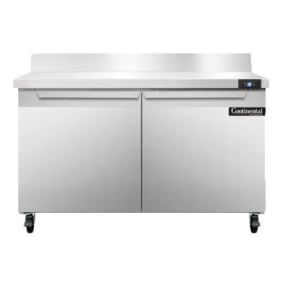 Elevate your cuisine with the Continental Refrigerator SW48NBS Refrigerated Counter. This work top refrigerator is designed to meet the demands of a commercial restaurant, offering a spacious 48"W and a generous 13.4 cu ft capacity. The stainless steel top with a 5-1/2"H backsplash provides a durable and easy-to-clean surface, perfect for food preparation. With two field rehingeable doors, you have easy access to your ingredients and supplies. The stainless steel front and end panels add a sleek and professional look to your kitchen. Inside, the aluminum interior ensures optimal temperature retention. The electronic control with a digital display allows for precise temperature adjustments, while the hi-low alarm alerts you of any temperature fluctuations. The rear mounted self-contained refrigeration system, powered by the eco-friendly R290 Hydrocarbon refrigerant, ensures efficient cooling. Made in the USA and certified by cETLus and NSF, this Continental Refrigerator is a reliable and high-quality addition to any commercial kitchen.