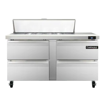 Elevate your dining experience with the Continental Refrigerator SW60N12-D Refrigerated Counter, Sandwich / Salad Unit. This top-of-the-line unit is designed to meet the demands of a commercial restaurant, offering a spacious 17.0 cu ft capacity and a two-section layout. With twelve 1/6 size x 4" deep pans and a 12" cutting board, you'll have plenty of space to prepare and store your ingredients. The four drawers are perfect for accommodating 12 x 20 x 6 pans, allowing for easy organization and accessibility. Made in the USA, this unit features stainless steel top, front, and end panels, as well as aluminum back and interior, ensuring durability and longevity. The electronic control with a digital display and hi-low alarm provides precise temperature management, while the rear-mounted self-contained refrigeration system ensures optimal cooling performance. Trust Continental Refrigerator to deliver a reliable and efficient refrigerated counter that will enhance your restaurant's operations.