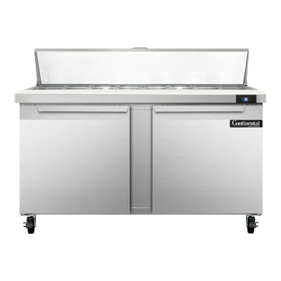 Discover kitchen perfection with the Continental Refrigerator SW60N16 Refrigerated Counter, Sandwich / Salad Unit. This two-section sandwich unit is designed to meet the needs of commercial restaurants, offering a spacious 17.0 cu ft capacity and (16) 1/6 size x 4" deep pans with a convenient 12" cutting board. The stainless steel top, front, and end panels ensure durability and easy cleaning, while the aluminum back and interior provide efficient insulation. With electronic control and a digital display, you can easily monitor and adjust the temperature to keep your ingredients fresh. The rear-mounted self-contained refrigeration system, powered by a 1/4 HP motor, ensures consistent cooling performance. Plus, the hi-low alarm alerts you if the temperature deviates from the desired range. Made in the USA and certified by cETLus and NSF, this Continental Refrigerator unit is a reliable and efficient addition to any commercial kitchen.