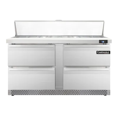 Enhance the heart of your restaurant with the Continental Refrigerator SW60N16C-FB-D Refrigerated Counter, Sandwich / Salad Unit. This two-section unit is designed to meet the needs of a busy commercial kitchen, offering a spacious 17.0 cu ft capacity. With (16) 1/6 size x 4" deep pans and a 19" cutting board, you'll have plenty of space to prepare and store your ingredients. The unit also features (4) drawers that can accommodate a 12 x 20 x 6 pan each (supplied by others), providing convenient storage options. Made in the USA, this sandwich unit is built to last, with stainless steel top, front, and end panels, as well as aluminum back and interior. The electronic control with digital display allows for precise temperature management, while the hi-low alarm ensures food safety. With rear mounted self-contained refrigeration and 3-3/4" casters, this unit is easy to move and position in your kitchen. Trust Continental Refrigerator for reliable, high-quality equipment that will elevate your restaurant's efficiency and productivity.