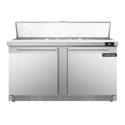 Deliver food perfection with the Continental Refrigerator SW60N16C-FB Refrigerated Counter, Sandwich / Salad Unit. This two-section sandwich unit is designed to meet the demands of a busy commercial restaurant. With a 17.0 cu ft capacity and (16) 1/6 size x 4" deep pans, you'll have plenty of space to store and organize your ingredients. The unit also features a 19" cutting board, allowing you to prepare sandwiches and salads with ease. The stainless steel top, front, and end panels ensure durability and easy cleaning, while the aluminum back and interior provide excellent insulation. The electronic control with a digital display allows for precise temperature management, and the hi-low alarm alerts you if the temperature goes outside the desired range. With rear-mounted self-contained refrigeration and 3-3/4" casters, this sandwich unit is easy to move and position in your kitchen. Trust Continental Refrigerator for quality and reliability. Made in the USA, this sandwich unit is cETLus and NSF certified, guaranteeing its safety and performance. Upgrade your restaurant's food preparation area with the Continental Refrigerator SW60N16C-FB Refrigerated Counter, Sandwich / Salad Unit.