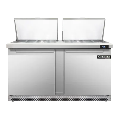 Fuel your restaurant's success with the Continental Refrigerator SW60N24M-FB Refrigerated Counter, Mega Top Sandwich/Salad Unit. This powerful unit is designed to meet the demands of a busy commercial kitchen, ensuring that your ingredients stay fresh and easily accessible. With a spacious 17.0 cu ft capacity and two sections, you'll have plenty of room to store all your sandwich and salad ingredients. The unit comes with 24 1/6 size pans, each 4" deep, and a convenient 10" cutting board for efficient food preparation. The stainless steel top, front, and end panels provide durability and a sleek appearance, while the aluminum back and interior make cleaning a breeze. The electronic control with a digital display allows for precise temperature management, and the hi-low alarm ensures that you're always aware of any temperature fluctuations. With rear-mounted self-contained refrigeration and 3-3/4" casters, this unit is easy to move and position in your kitchen. Trust in the Continental Refrigerator SW60N24M-FB to enhance your restaurant's efficiency and productivity.