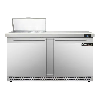 Master the art of cooking with the Continental Refrigerator SW60N8-FB Refrigerated Counter, Sandwich / Salad Unit. This top-of-the-line unit is designed to meet the needs of commercial restaurants, offering a spacious 17.0 cu ft capacity and a two-section layout. With eight 1/6 size x 4" deep pans and a 12" cutting board, you'll have plenty of space to prepare and store your ingredients. The stainless steel top, front, and end panels ensure durability and easy cleaning, while the aluminum back and interior provide excellent insulation. The electronic control with a digital display allows for precise temperature management, and the hi-low alarm ensures that your food stays fresh and safe. With rear-mounted self-contained refrigeration and 3-3/4" casters, this unit is easy to move and position in your kitchen. Made in the USA and certified by cETLus and NSF, the Continental Refrigerator SW60N8-FB is a reliable and efficient choice for any commercial restaurant.