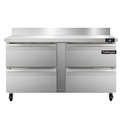Master the art of cooking with the Continental Refrigerator SW60NBS-D Refrigerated Counter. This work top refrigerator is designed to meet the demands of a busy commercial restaurant kitchen. With a spacious 60"W and a generous 17.0 cu ft capacity, this two-section unit provides ample storage space for all your ingredients. The stainless steel top with a 5-1/2"H backsplash ensures durability and easy cleaning, while the four drawers allow for efficient organization. Each drawer can accommodate a 12 x 20 x 6 pan, making it convenient to store and access your food items. The electronic control with a digital display allows for precise temperature management, and the hi-low alarm ensures food safety. Made in the USA, this refrigerator features rear mounted self-contained refrigeration and uses R290 Hydrocarbon refrigerant for energy efficiency. Trust Continental Refrigerator to deliver reliable and high-quality equipment for your commercial kitchen needs.