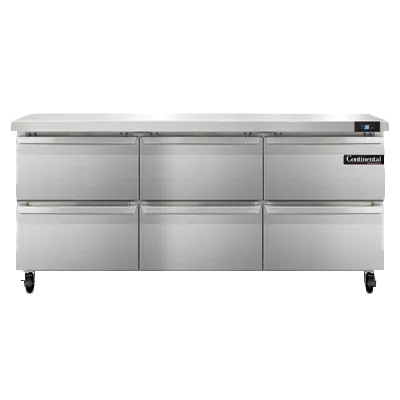 Serve with pride with the Continental Refrigerator SW72N-D Refrigerated Counter. This work top refrigerator is designed to meet the demands of a busy commercial restaurant. With a spacious 72" width and a generous 20.6 cu ft capacity, this three-section unit provides ample storage space for all your ingredients. The stainless steel flat top is not only durable but also easy to clean, making it perfect for food preparation. The six drawers are designed to accommodate various pan sizes, allowing for flexible storage options. The electronic control with a digital display ensures precise temperature management, while the hi-low alarm alerts you to any fluctuations. Made in the USA, this refrigerated counter is built to last and is NSF and cETLus certified for added peace of mind. Upgrade your kitchen with the Continental Refrigerator SW72N-D and experience the convenience and reliability it brings to your restaurant operations.