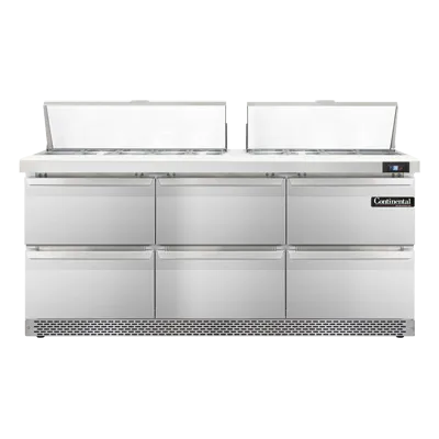 Experience kitchen innovation with the Continental Refrigerator SW72N18-FB-D Refrigerated Counter, Sandwich / Salad Unit. This top-of-the-line unit is designed to meet the demands of a busy commercial restaurant. With a spacious 72" width and a 20.6 cu ft capacity, this three-section sandwich unit provides ample storage for all your ingredients. It comes equipped with 18 1/6 size pans, each 4" deep, and a convenient 12" cutting board for easy food preparation. The unit also features six drawers that can accommodate either a 12 x 18 x 6 pan or a 1/2 x 6 and a 1/3 x 6 pan, giving you versatile storage options. Made in the USA, this sandwich unit boasts a stainless steel top, front, and end panels, as well as an aluminum back and interior, ensuring durability and longevity. The electronic control with a digital display and hi-low alarm allows for precise temperature management, while the rear-mounted self-contained refrigeration system ensures efficient cooling. With 3-3/4" casters, this unit is easy to move and clean. Trust Continental Refrigerator for reliable and high-quality refrigeration solutions for your commercial kitchen.