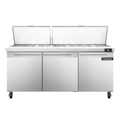Introducing the Continental Refrigerator SW72N30M Refrigerated Counter, Mega Top Sandwich / Salad Unit. Dominate the culinary world with this powerful and versatile addition to your commercial kitchen. With a spacious 72" width and a generous 20.6 cu ft capacity, this three-section unit is perfect for busy restaurants and delis. It comes equipped with (30) 1/6 size x 4" deep pans and a convenient 10" cutting board, allowing you to easily prepare and assemble a wide variety of sandwiches and salads. The stainless steel top, front, and end panels ensure durability and easy cleaning, while the aluminum back and interior provide excellent insulation. The electronic control with a digital display allows for precise temperature management, and the hi-low alarm ensures food safety. With rear-mounted self-contained refrigeration and a 1/4 HP compressor, this unit is both efficient and reliable. Made in the USA and certified by cETLus and NSF, the Continental Refrigerator SW72N30M is the ultimate choice for commercial restaurant use.