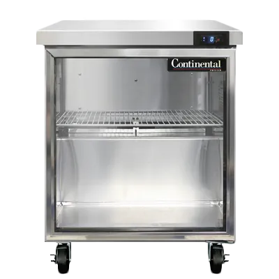 Experience kitchen innovation with the Continental Refrigerator SWF27NGD Freezer Counter. This work top display freezer is designed to meet the demands of a commercial restaurant, offering a spacious 7.4 cu ft capacity in a compact 27" width. The stainless steel flat top provides a durable and easy-to-clean surface, while the glass door allows for convenient visibility of the contents. With stainless steel front and end panels, as well as an aluminum interior, this freezer counter is built to withstand the rigors of a busy kitchen. The electronic control with digital display ensures precise temperature management, while the hi-low alarm alerts staff to any fluctuations. The rear mounted self-contained refrigeration system, powered by a 1/3 HP compressor, ensures efficient cooling performance. Made in the USA and certified by cETLus and NSF, this Continental Refrigerator SWF27NGD is the perfect addition to any commercial restaurant seeking reliable and high-quality refrigeration equipment.