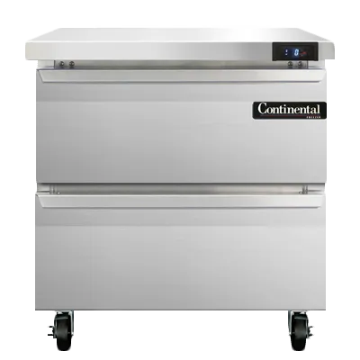 Introducing the Continental Refrigerator SWF32N-D Freezer Counter, Work Top - the ultimate tool to dominate the culinary world. With its sleek stainless steel flat top and two spacious drawers, this work top freezer offers a 9.0 cu ft capacity, perfect for storing and organizing your ingredients. Each drawer can accommodate either a 12 x 20 x 6 pan or a 1/2 x 6 pan and two 1/3 x 6 pans, giving you the flexibility to customize your storage needs. The stainless steel front and end panels ensure durability and easy cleaning, while the aluminum interior provides excellent insulation. Equipped with an electronic control with a digital display and a hi-low alarm, you can easily monitor and adjust the temperature to keep your ingredients fresh. The rear mounted self-contained refrigeration system, powered by the eco-friendly R290 Hydrocarbon refrigerant and a 1/3 HP compressor, ensures efficient cooling. Made in the USA and certified by cETLus and NSF, this Continental Refrigerator SWF32N-D Freezer Counter, Work Top is the perfect addition to any commercial restaurant.