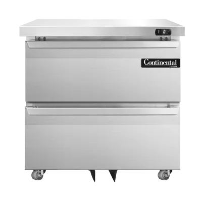 Elevate your cuisine with the Continental Refrigerator SWF32N-U-D Freezer. This undercounter reach-in freezer is designed to meet the demands of a commercial restaurant, offering a spacious 9.0 cu ft capacity in a compact 32" width. With its two drawers, this freezer can accommodate a variety of pans, including 12 x 18 x 6 pans or a combination of 1/2 x 6 pans and 1/3 x 6 pans. The stainless steel front, top, and end panels ensure durability and a sleek appearance, while the aluminum interior provides easy cleaning and maintenance. Equipped with front breathing and rear-mounted self-contained refrigeration, this freezer offers efficient cooling and temperature control. The electronic control with a digital display and hi-low alarm allows for precise monitoring and adjustment. Made in the USA and certified by cETLus and NSF, the Continental Refrigerator SWF32N-U-D Freezer is a reliable and high-quality addition to any commercial kitchen.