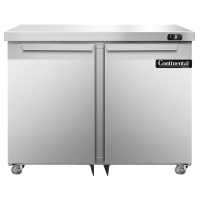 Realize kitchen dreams with the Continental Refrigerator SWF36N-U Freezer. This undercounter reach-in freezer is designed to meet the needs of commercial restaurants, offering a spacious 10.3 cu ft capacity in a compact two-section design. The stainless steel front, top, and end panels not only provide durability but also add a sleek and professional look to any kitchen. The aluminum interior ensures easy cleaning and maintenance. With field rehingeable doors, this freezer offers flexibility in installation. The front breathing design and rear-mounted self-contained refrigeration system ensure efficient cooling without taking up valuable kitchen space. The electronic control with a digital display allows for precise temperature management, while the hi-low alarm alerts staff to any temperature fluctuations. Equipped with 1-3/8" diameter plate casters, this freezer can be easily moved for cleaning or rearranging. Made in the USA and certified by cETLus and NSF, the Continental Refrigerator SWF36N-U is the perfect addition to any commercial kitchen.