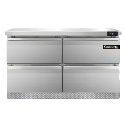 Empower your kitchen staff with the Continental Refrigerator SWF48N-FB-D Freezer Counter. This work top freezer is designed to meet the demands of a busy commercial restaurant. With a 48" width and a 13.4 cu ft capacity, it provides ample space for storing ingredients and prepared dishes. The stainless steel flat top not only offers a durable and easy-to-clean surface but also serves as a convenient workspace. The four drawers are designed to accommodate various pan sizes, allowing for efficient organization and easy access to items. The electronic control with a digital display ensures precise temperature management, while the hi-low alarm alerts staff to any fluctuations. With rear-mounted self-contained refrigeration and 3-3/4" casters, this freezer counter is easy to move and position in your kitchen. Made in the USA and certified by cETLus and NSF, you can trust in the quality and reliability of this Continental Refrigerator. Upgrade your kitchen with the SWF48N-FB-D Freezer Counter and experience enhanced efficiency and productivity.