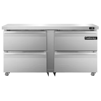 Master the art of cooking with the Continental Refrigerator SWF60N-U-D Freezer. This undercounter reach-in freezer is designed to meet the demands of a commercial restaurant kitchen. With a spacious 17.0 cu ft capacity and four drawers, it offers ample storage space for your ingredients and prepared dishes. Each drawer can accommodate a 12 x 20 x 6 pan, allowing for easy organization and access. The stainless steel front, top, and end panels ensure durability and a sleek appearance that will complement any kitchen decor. The aluminum interior is easy to clean and maintain. Equipped with a rear-mounted self-contained refrigeration system and electronic control with a digital display, this freezer provides precise temperature control and a hi-low alarm to ensure your food stays fresh and safe. The Continental Refrigerator SWF60N-U-D Freezer is made in the USA and is cETLus and NSF certified, guaranteeing its quality and reliability. Upgrade your kitchen with this high-performance freezer and experience the convenience and efficiency it brings to your culinary endeavors.