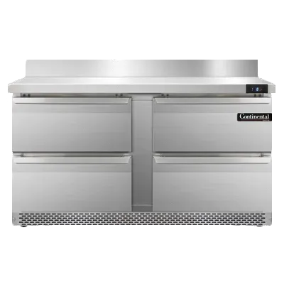 Realize kitchen dreams with the Continental Refrigerator SWF60NBS-FB-D Freezer Counter. This work top freezer is designed to meet the demands of a busy commercial restaurant. With a spacious 60"W size and a 17.0 cu ft capacity, it provides ample storage space for all your frozen ingredients. The four drawers are designed to accommodate one 12x20x6 pan each, allowing for easy organization and access to your ingredients. The stainless steel top with a 5-1/2"H backsplash ensures durability and easy cleaning, while the stainless steel front and end panels add a sleek and professional look to your kitchen. The electronic control with a digital display and hi-low alarm allows for precise temperature control and monitoring. With rear mounted self-contained refrigeration and 3-3/4" casters, this freezer counter is easy to move and position in your kitchen. Made in the USA and certified by cETLus and NSF, you can trust the quality and reliability of this Continental Refrigerator. Upgrade your kitchen with the SWF60NBS-FB-D Freezer Counter and experience the convenience and efficiency it brings to your restaurant operations.