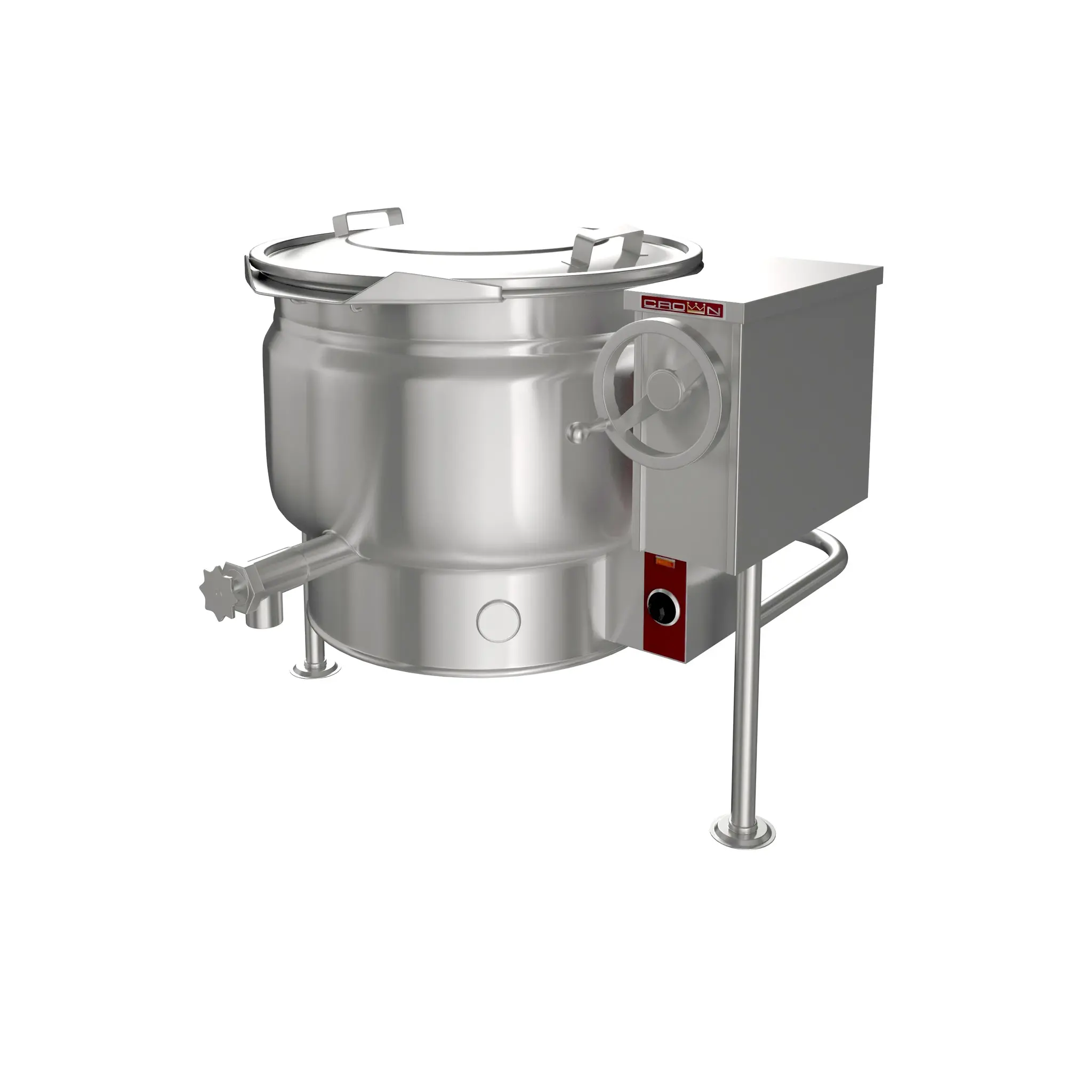 Experience the unmatched performance of these Crown kettles, designed specifically for efficiency and ease of use. With their self-generating, electric, tilting, full-jacket construction, these kettles ensure optimal cooking results while maintaining a low height for convenient access. The innovative double-walled interior creates a steam jacket around the kettle, containing factory-sealed distilled water for superior thermal management. Crafted from all-welded, #4 finish stainless steel, type 304, these kettles not only offer durability but also a sleek appearance. The kettle’s hemispherical bottom design promotes exceptional heat circulation, ensuring uniform cooking every time. The console, made from drip-proof stainless steel, is supported by a robust frame of 1-5/8” (41 mm) diameter stainless steel pipes, complete with adjustable legs for secure flooring attachment. Ease of operation is a hallmark of this design. The kettle pivots effortlessly on a trunnion connected to an advanced tilt mechanism, allowing for a full 90-degree tilt to ensure complete emptying. The self-locking tilt mechanism guarantees a positive stop action, providing both safety and reliability. For high-acid cooking applications, the kettle liner is standard with type 316 stainless steel, reflecting our commitment to quality. The integrally mounted controls include a user-friendly power switch, thermostat, pilot light, low water indicator, vacuum/pressure gauge, safety relief valve, and low water shut-off—everything you need for seamless operation. With removable heating elements and a wide temperature range of 165°F to 285°F (74°C to 140°C) at a maximum pressure of 50 psi (345 kPa), these kettles are the ultimate choice for any commercial kitchen. Investing in a Crown kettle means investing in quality, efficiency, and superior culinary results. Make the smart choice today!