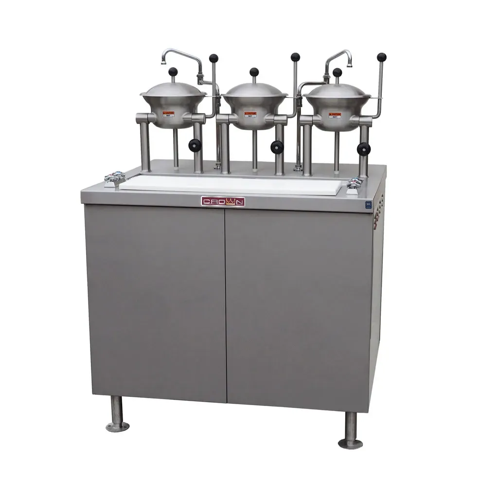 The Crown Oyster Cookers are constructed from type 316 stainless steel, featuring both inner and outer shells with a #4 finish and one-piece welded construction. Each 2-quart cooker is equipped with a tilt handle and heat-resistant knob, allowing the cooker to tilt 90° for complete emptying. The stainless steel mounting legs house the steam supply and condensate, with the right leg fitted with a steam control valve for precise operation. A stainless steel lift-off cover is provided as standard. The cookers are mounted on a cabinet base with a full perimeter angle frame, reinforced counter, and a spillage sink complete with drain and drain screen. The base also includes boiler mountings, gas boiler with controls, hinged doors with magnetic catches, removable side panels, and 6” (152 mm) stainless steel legs fitted with 4 adjustable flanged feet for secure floor mounting. The entire unit features an all #4 finish stainless steel exterior. The steam manifold is concealed within the cabinet and is equipped with a steam trap and safety relief valve. The unit comes standard with CSD-1 boiler controls, electronic ignition, split water line, and auto blow-down.
