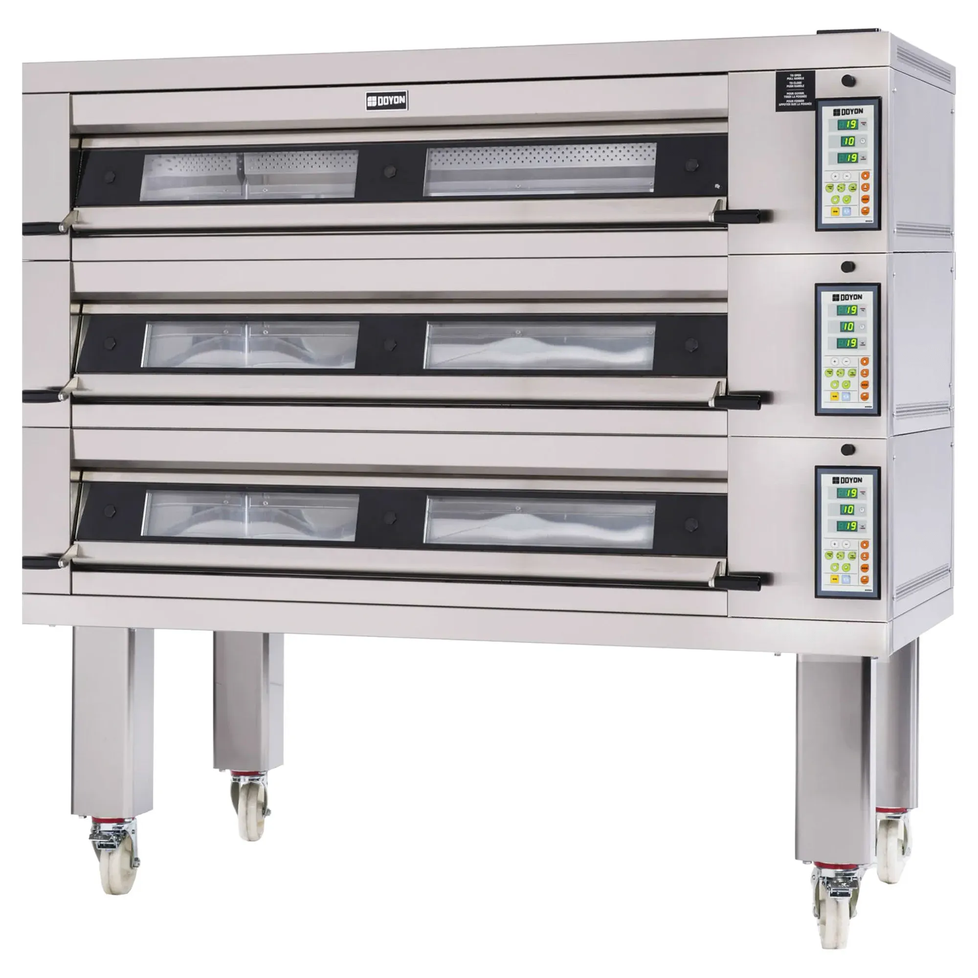Ignite a new era of innovation effortlessly with the Doyon-Nuvu 3T-3 Electric Deck-Type Oven. Designed for commercial restaurant use, this artisan stone triple deck oven is a game-changer in the culinary world. With its energy miser/governor feature, you can save on electricity costs without compromising performance. The stone hearth bake deck ensures even heat distribution, resulting in perfectly baked goods every time. Each deck has a capacity of three pans, allowing you to bake multiple items simultaneously. The individual digital electronic temperature control per deck (3 zones) gives you precise control over the baking process. Plus, the self-contained steam injection per deck ensures moist and flavorful results. This oven comes complete with a stand and oven cover for convenience. ETL, cETLus, CE, and ISO certifications guarantee its quality and safety. Elevate your restaurant's baking capabilities with the Doyon-Nuvu 3T-3 Electric Deck-Type Oven.