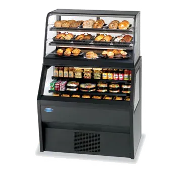 Introducing the Federal Industries CD3628SS/RSS3SC Display Case, Refrigerated/Non-Refrig a versatile solution for effortless presentation of variety in commercial restaurants. This specialty display hybrid merchandiser offers a refrigerated self-serve bottom with a non-refrigerated self-service top, providing the perfect combination of temperature control and accessibility. The black laminated exterior with black trim exudes a sleek and professional look, while the horizontal LED top and front light illuminates your products beautifully. With two tiers of black metal shelves and tempered glass ends, you can showcase your offerings in an organized and visually appealing manner. The non-refrigerated self-service top features three hinged lift-up front doors, black trim, and two-tier black wire shelves, allowing for easy access and display of non-perishable items. The sliding rear doors ensure convenient restocking. With a 1/3 HP motor, this display case is both powerful and energy-efficient. Trust Federal Industries for a reliable and stylish addition to your restaurant.