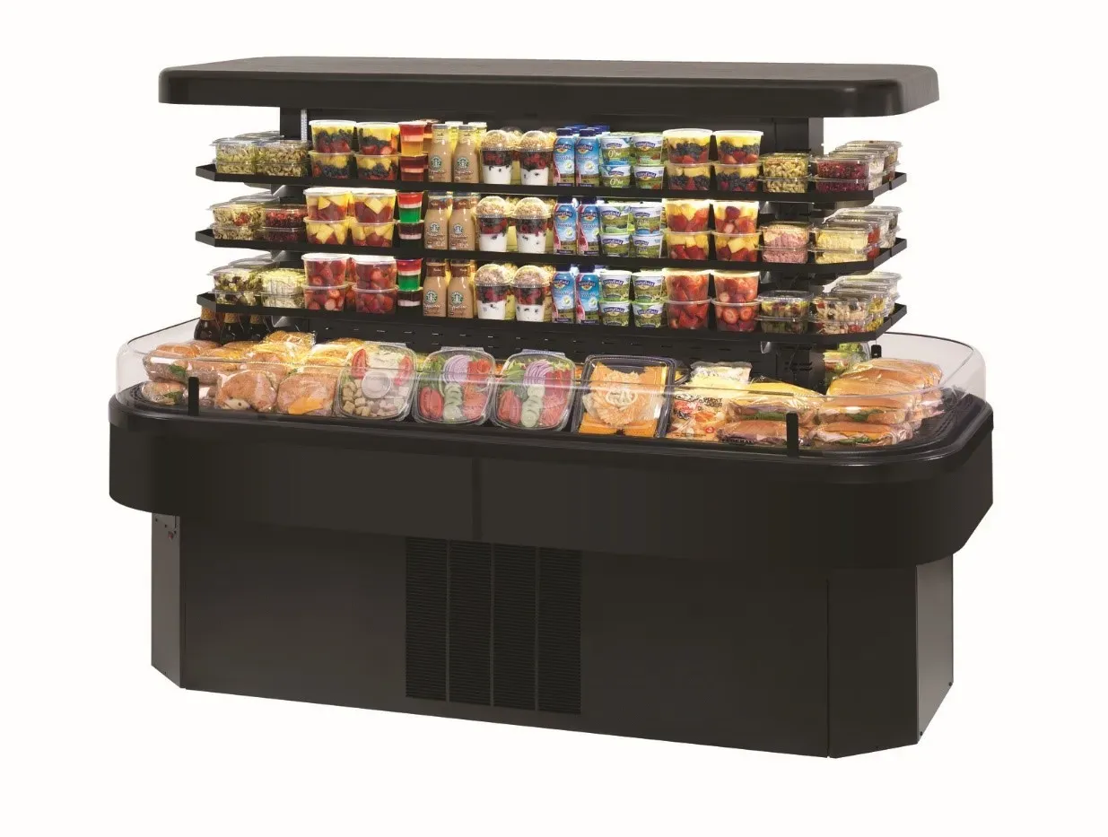 Introducing the Federal Industries EIMSS84SC-3 Refrigerated Self-Serve Island, the ultimate solution for versatile presentation in commercial restaurants. This self-serve refrigerated merchandiser is designed to enhance your food display while keeping it fresh and enticing. With its spacious 84"W x 40"D x 60"H dimensions, this unit offers ample space for showcasing a wide variety of food items. The adjustable temperature control ensures that your products are kept at the perfect temperature, while the LED top and undershelf lighting beautifully illuminates your offerings. Featuring three tiers of adjustable black metal shelves and an air deflector, this island provides maximum flexibility for arranging your products. The black metal base, interior, and canopy exude a sleek and modern aesthetic that will complement any restaurant decor. With its self-contained refrigeration system and condensate pan, this unit is easy to maintain and operate. Trust in the quality and reliability of Federal Industries, a trusted name in the industry. Elevate your restaurant's presentation with the Federal Industries EIMSS84SC-3 Refrigerated Self-Serve Island.