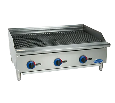 Enhance the heart of your restaurant with the Globe C36CB-SR Gas Charbroiler. This countertop charbroiler is designed to deliver exceptional performance and durability in a commercial restaurant setting. The 10 gauge stainless steel radiant and U-style burner provide precise heat control every 12 inches, ensuring even cooking and delicious results. With a powerful 35,000 BTU burner, this charbroiler can handle high-volume cooking with ease. The heavy-duty cast iron grates offer three adjustable grilling positions, allowing you to customize the cooking surface to suit your needs. The stainless steel construction and cool-to-touch front edge ensure long-lasting durability and safety. The adjustable pilots with front access make maintenance and operation a breeze. Plus, this charbroiler is field convertible to radiant or combination, giving you versatility in your cooking options. Trust Globe to deliver reliable and efficient equipment for your restaurant's success.