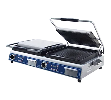 Kitchen innovation at its best, the Globe GPGDUE14D Sandwich/Panini Grill is a must-have for any commercial restaurant. With its double countertop design, this electric grill allows for efficient and simultaneous grilling of sandwiches and paninis. The cast iron grooved plates ensure even heat distribution and create those perfect grill marks that customers love. The electronic timer with four programmable presets makes it easy to achieve consistent results every time. The temperature control can reach up to 570F, giving you the flexibility to cook a variety of menu items. The spring hinge with adjustable tension allows for easy operation and ensures even pressure on your sandwiches. Cleaning up is a breeze with the stainless steel removable catch tray and scraper. Made with durable stainless steel construction, this grill is built to withstand the demands of a busy commercial kitchen. Upgrade your restaurant's sandwich and panini game with the Globe GPGDUE14D Sandwich/Panini Grill.
