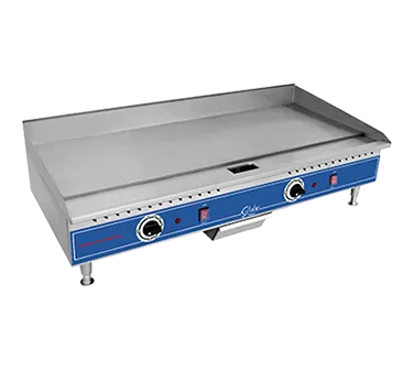 Ignite culinary passion with the Globe PG36E Electric Countertop Griddle. This high-quality griddle is a must-have for any commercial restaurant. With a plate depth of 13" and a 3/8" thick griddle surface, it provides ample space for cooking a variety of dishes. The griddle features two 70-575F thermostat controls, allowing you to easily adjust the temperature for different cooking needs. Each element also has its own on/off switch, giving you precise control over the cooking process. The stainless steel removable catch tray has a capacity of 4-1/2 cups, making cleanup a breeze. With a splash guard on three sides, you can cook without worrying about grease splatters. The griddle is also equipped with 3-1/2" stainless steel adjustable feet, ensuring stability during use. Hardwired for 208/240v/60/1-ph, this griddle is NSF and cULus certified, guaranteeing its safety and reliability. Upgrade your restaurant's cooking capabilities with the Globe PG36E Electric Countertop Griddle.