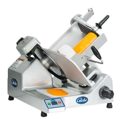 Invest in superior quality with the Globe S13 Food Slicer. This premium heavy-duty slicer is a must-have for any commercial restaurant. With its 13-inch steel knife and top-mounted removable sharpener with synthetic diamond surfaces, you can effortlessly slice through a variety of ingredients with precision and ease. The knife cover interlock ensures safety during operation, while the kickstand provides stability when not in use. The seamless anodized aluminum base is not only durable but also easy to clean, making it perfect for busy kitchens. Powered by a 1/2 HP knife motor, this slicer delivers consistent and efficient performance. Whether you're slicing meats, cheeses, or vegetables, the Globe S13 Food Slicer is designed to meet the demands of a commercial restaurant. Invest in this reliable and high-quality slicer to enhance your food preparation process. Made in the USA, this slicer is cETLus and ETL-Sanitation certified, ensuring its safety and reliability. Upgrade your kitchen with the Globe S13 Food Slicer today.