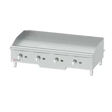 Optimize efficiency with quality tools. Introducing the Grindmaster-cecilware GCP48 Gas Countertop Griddle, designed to elevate your commercial restaurant's cooking experience. With a spacious 48"W x 20"D cooking surface and a 1" thick steel griddle plate, this griddle provides ample space for preparing multiple dishes simultaneously. The four 30,000 BTU/hr stainless steel burners ensure fast and even heating, while the manual controls allow for precise temperature adjustments. The independent cooking zones enable you to cook different foods at different temperatures simultaneously, increasing productivity and reducing waiting times. Made with durable stainless steel construction, this griddle is built to withstand the demands of a busy kitchen. With a powerful 120,000 BTU/hr output, this griddle delivers exceptional performance, ensuring consistent and delicious results every time. Trust Grindmaster-cecilware for reliable and efficient cooking equipment that enhances your restaurant's operations.