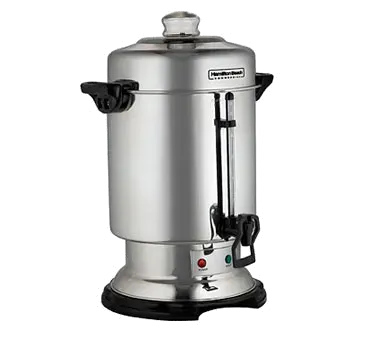 Master the art of cooking with the Hamilton Beach D50065 Coffee Percolator. This electric coffee urn is designed to meet the demands of a commercial restaurant, with a generous 60-cup capacity that ensures you never run out of coffee during busy hours. The cup trip handle allows for easy pouring, while the water/coffee window lets you monitor the brewing process without lifting the lid. The stainless steel exterior not only adds a sleek and professional look to your kitchen but also ensures durability and easy cleaning. With power on and ready lights, you can easily keep track of the brewing status. This coffee percolator operates on 120v/60/1-ph power and is cULus certified, guaranteeing its safety and reliability. Trust Hamilton Beach, a reputable vendor known for their high-quality kitchen appliances, and elevate your restaurant's coffee game with the D50065 Coffee Percolator.