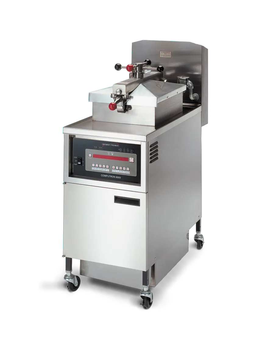 Frying under pressure enables lower cooking temperatures for longer oil life, and faster cooking times to meet peak demand. The PFG 600 gas pressure fryer's fast recovery translates into higher throughput, lower energy costs and longer frying oil life. Henny Penny pressure fryers have a patented lid lock and color-keyed spindle that make it easy to create a perfect pressure seal every time. A built-in filtration system filters and returns hot frying oil in minutes. No separate pumps and pans, no handling hot oil. The Computron™ 8000 control features automatic, programmable operation, as well as energy-saving, filtration and cook management functions.