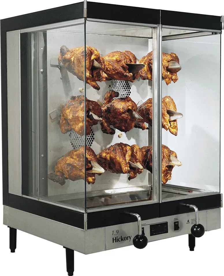 Elevate Culinary Experiences with Professional Gear using the Hickory Industries N/1.9E Electric Rotisserie Oven. Designed for commercial restaurant use, this stainless steel oven is a game-changer for batch cooking. With a capacity to hold up to 9 chickens, it allows you to efficiently prepare large quantities of succulent, evenly cooked meat. The 2 pivoting tempered glass display doors not only showcase your culinary creations but also make it easy to monitor the cooking process. The manual control and interior display lighting provide precise control and visibility, ensuring perfect results every time. Whether you choose to place it on the countertop or mount it on the wall, this rotisserie oven is a versatile addition to any kitchen. It complies with all national and international voltage standards, making it suitable for use anywhere. Upgrade your restaurant's cooking capabilities with the Hickory Industries N/1.9E Electric Rotisserie Oven.