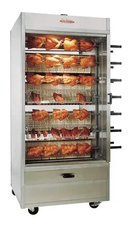 Achieve Culinary Excellence with Reliable Gear using the Hickory Industries, N/14EP OPT 32, Oven, Rotisserie, Electric, Continuous Cook. This stainless steel, floor model rotisserie oven is a game-changer for commercial restaurants. With a capacity to cook 56-84 chickens at once, it ensures efficient and high-volume cooking. The pivoting tempered glass doors not only provide easy access but also allow customers to witness the mouthwatering display of succulent meats. The interior display lighting further enhances the visual appeal. Equipped with manual control, this oven gives chefs complete command over the cooking process. It meets all national and international voltage standards, making it suitable for any restaurant worldwide. The 5" castors provide mobility, allowing for easy cleaning and rearrangement. With dimensions of 38 1/4W x 31D x 74H, this electric rotisserie oven is a must-have for any commercial kitchen looking to elevate their culinary offerings.