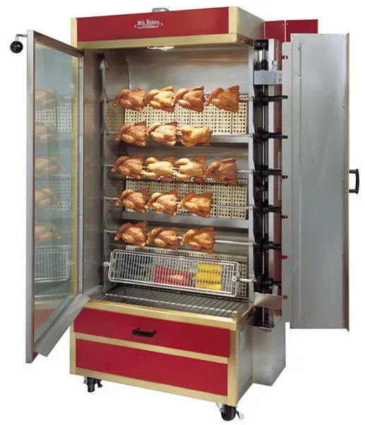 Transform Kitchen Dynamics with Pro Appliances using the Hickory Industries N/7EP OPT 32 Oven, Rotisserie, Electric, Continuous Cook. This stainless steel, floor model oven is designed to revolutionize your restaurant's cooking capabilities. With a 28-35 chicken capacity, this electric rotisserie oven is perfect for high-volume cooking. The pivoting tempered glass doors not only provide easy access to your food but also create an enticing display for your customers. The interior display lighting further enhances the visual appeal. The manual control allows for precise cooking adjustments, ensuring consistent and delicious results every time. Whether you need a right-hand or left-hand option, this oven can be customized to fit your kitchen layout. With all national and international voltage standards available, this oven is suitable for any location. The 5" castors make it easy to move and clean. Upgrade your restaurant's cooking capabilities with the Hickory Industries N/7EP OPT 32 Oven, Rotisserie, Electric, Continuous Cook.