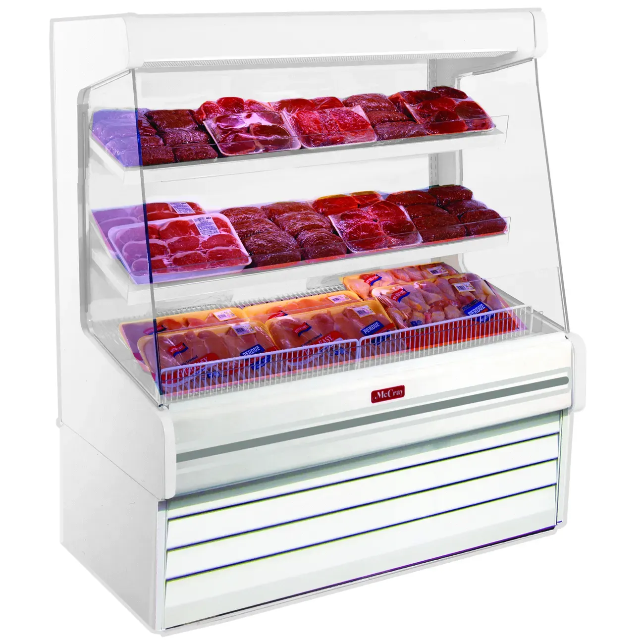 Serve with pride with the Howard-McCray SC-OM30E-4L-LED Merchandiser, Open Refrigerated Display. This self-contained refrigeration unit is designed specifically for commercial restaurant use, offering a sleek and efficient way to showcase your meat products. With its 51" width and 60" height, this merchandiser provides ample space for displaying your meats in an attractive and organized manner. The two rows of slanted lighted shelves with product stops ensure that your products are prominently displayed and easily accessible to customers. The LED lighting not only enhances the visibility of your meats but also adds a touch of elegance to your display. The removable ends allow for a continuous line-up, creating a seamless and professional look. With its white exterior and interior, this merchandiser exudes cleanliness and sophistication. Powered by a 1/2 HP motor and requiring a NEMA 5-20P plug, this unit is both powerful and energy-efficient. Invest in the Howard-McCray SC-OM30E-4L-LED Merchandiser, Open Refrigerated Display and elevate your meat display to the next level.