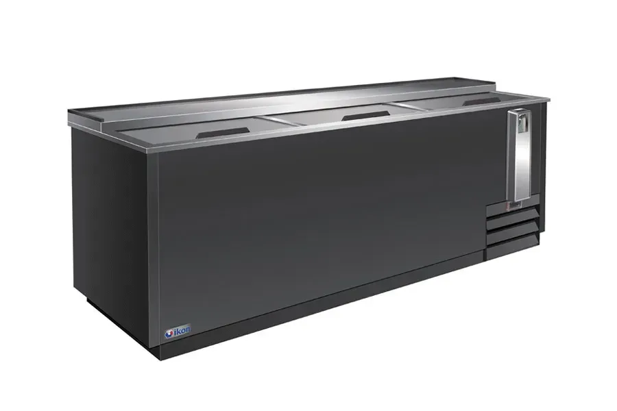 Modernize your operations with the MVP IBC-95 Bottle Cooler. This sleek and efficient cooler is designed to meet the demands of a busy commercial restaurant. With a spacious 30.3 cu. ft. capacity, it can accommodate a large quantity of bottles, ensuring you never run out of chilled beverages. The stainless steel top with rear raised glass rails adds a touch of elegance to your establishment while providing easy access to the bottles. The three sliding lids are lockable, keeping your inventory secure. The electronic thermostat allows you to set the temperature between 33 and 41F, ensuring your drinks are always perfectly chilled. The digital LED temperature display provides easy monitoring. With five bin dividers, you can organize your bottles efficiently. The bottle opener with cap catcher is a convenient addition. The stainless steel interior is easy to clean, and the black exterior adds a modern touch. The side-mounted self-contained refrigeration system ensures optimal performance. The MVP IBC-95 Bottle Cooler is equipped with 1" wheels for easy mobility. Upgrade your restaurant with this reliable and stylish bottle cooler.