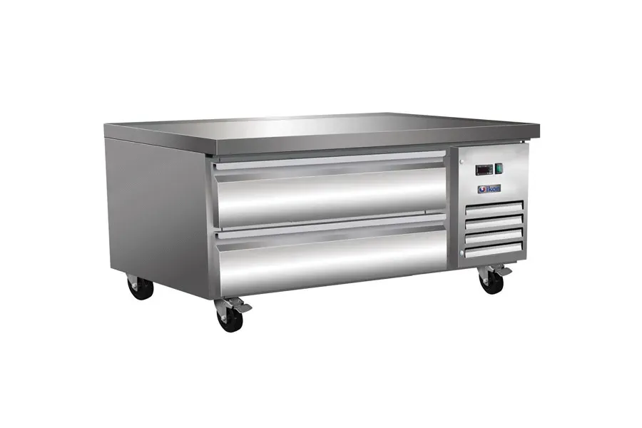 Modernize your operations with the MVP ICBR-50 Chef Base. This IKON Series Chef Base Refrigerator is designed to enhance efficiency in your commercial restaurant. With its sleek stainless steel construction and side-mounted self-contained refrigeration system, this chef base is both durable and space-saving. The unit features two drawers with an electronic thermostat and LED temperature display, allowing you to easily monitor and adjust the temperature within the 33 - 41F range. The automatic defrost system ensures hassle-free maintenance, while the swivel casters, two of which are braked, provide easy mobility and stability. Powered by a 1/3 HP motor, this chef base is reliable and efficient. Whether you need to store ingredients or keep prepared dishes cool, the MVP ICBR-50 Chef Base is the perfect addition to your restaurant kitchen.