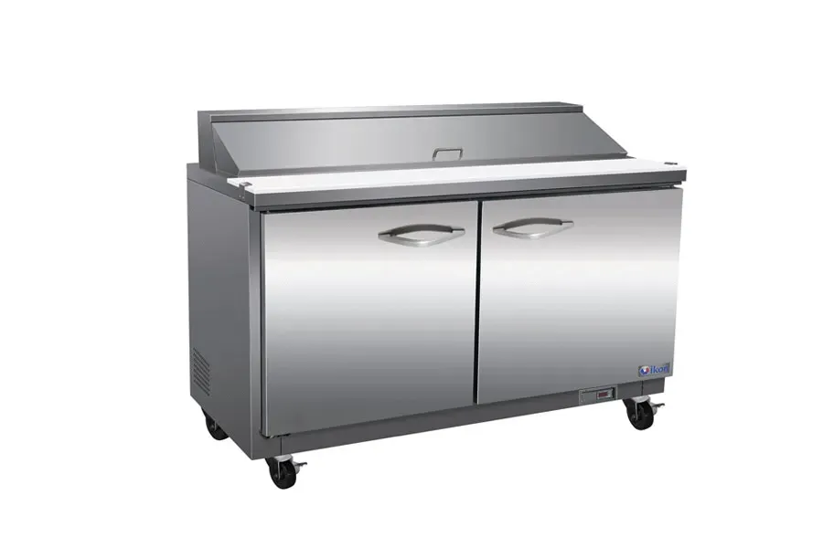 Upgrade operations with versatile options through the MVP ISP61 Refrigerated Counter, Sandwich / Salad Unit. This two-section unit offers a spacious 15.5 cu. ft. capacity, perfect for commercial restaurant use. The stainless steel top features an opening for 16 included 1/6 pans, allowing for easy organization and access to ingredients. With two solid hinged doors and adjustable shelves, you can customize the unit to suit your needs. The removable cutting board provides a convenient workspace, while the electronic thermostat ensures precise temperature control within the 33 - 40F range. The digital LED temperature display allows for easy monitoring. The interior features a 304 stainless steel floor, aluminum back wall, and ABS side walls & door backs for durability and easy cleaning. The rear-mounted self-contained refrigeration system, powered by R290 refrigerant and a 1/2 HP motor, ensures efficient cooling. Upgrade your restaurant's food preparation capabilities with the MVP ISP61 Refrigerated Counter, Sandwich / Salad Unit.