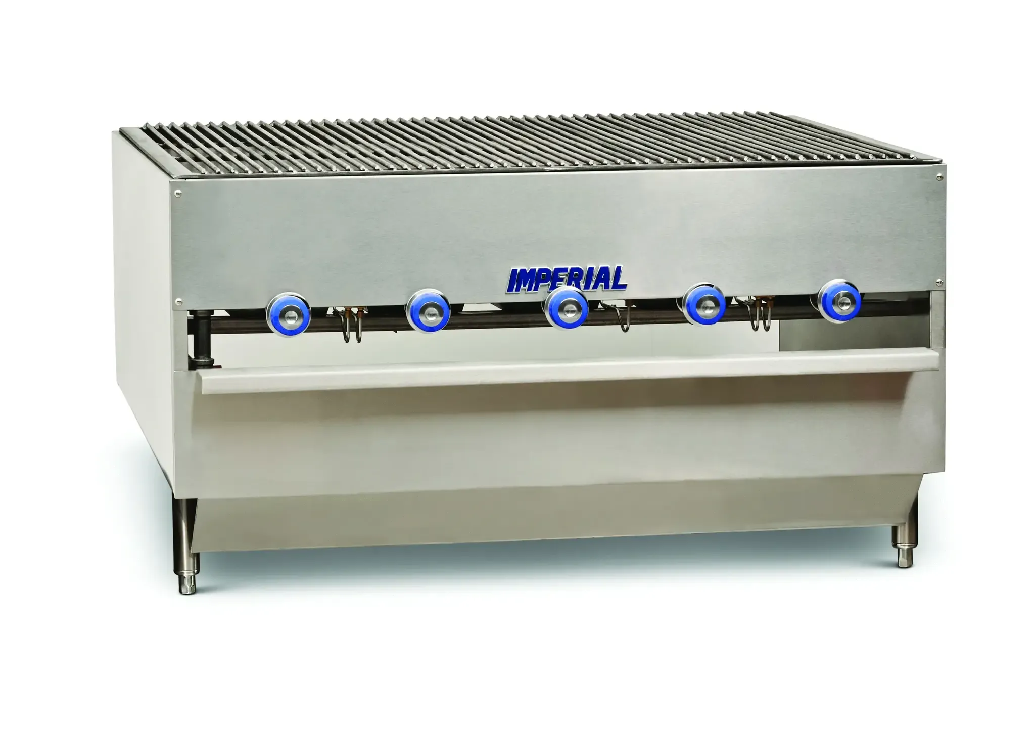 Ignite culinary passion with the Imperial ICB-6036 Chicken Charbroiler. This gas countertop charbroiler is a must-have for any commercial restaurant. With its six radiant "H" burners and round rod grates, it delivers exceptional heat distribution and creates those perfect grill marks on your chicken. The 36-inch deep broiling surface provides ample space to cook large quantities of chicken at once, making it ideal for busy kitchens. Made with a stainless steel front and sides, this charbroiler is not only durable but also easy to clean. The 4-inch legs ensure stability and allow for easy placement on any countertop. With a powerful 300,000 BTU, this charbroiler is designed to handle high-volume cooking. NSF certified, you can trust the quality and safety of this Imperial Chicken Charbroiler. Elevate your restaurant's grilling game with the ICB-6036.