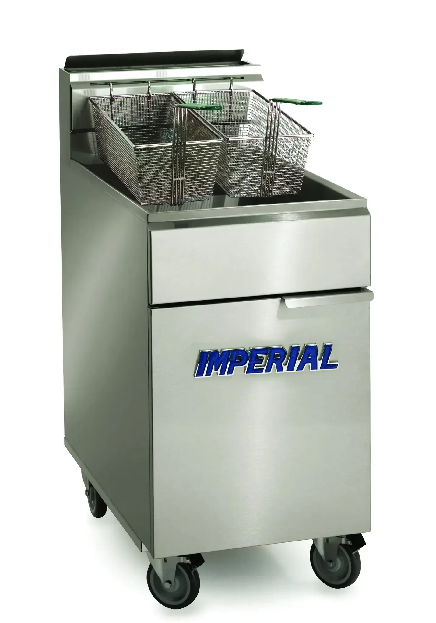 Equip your kitchen for success with the Imperial IFS-75 Gas Floor Model Fryer. This high-capacity fryer is perfect for commercial restaurant use, with a 75 lb. capacity that allows you to fry large quantities of food quickly and efficiently. The tube fired cast iron burners and snap action thermostat ensure precise temperature control, while the millivolt temperature control allows for easy adjustments. The fryer comes with two nickel-plated baskets and a wire mesh crumb screen, making it easy to fry multiple items at once and keep your fryer clean. The stainless steel construction of the front, door, sides, basket hanger, and frypot ensures durability and easy cleaning. With 175,000 BTU of power, this fryer is CSA Flame, CSA Star, NSF, and CE certified, guaranteeing its safety and reliability. Upgrade your kitchen with the Imperial IFS-75 Gas Floor Model Fryer and experience the difference in performance and efficiency.