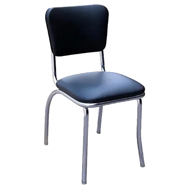 Experience kitchen innovation with the JustChair Manufacturing C64018-PS-BLK Chair. This retro-style diner side chair is designed to bring a touch of nostalgia to your restaurant while providing comfort and durability. The upholstered pullover padded back and padded seat ensure that your guests can relax and enjoy their meal in style. The chrome frame adds a sleek and modern touch to the chair's design, making it a perfect fit for any contemporary restaurant setting. The black vinyl upholstery not only adds a touch of elegance but also makes the chair easy to clean and maintain, ideal for busy commercial restaurant use. With its sturdy construction and high-quality materials, this chair is built to withstand the rigors of a busy restaurant environment. Enhance your restaurant's ambiance and provide your guests with a comfortable dining experience with the JustChair Manufacturing C64018-PS-BLK Chair.
