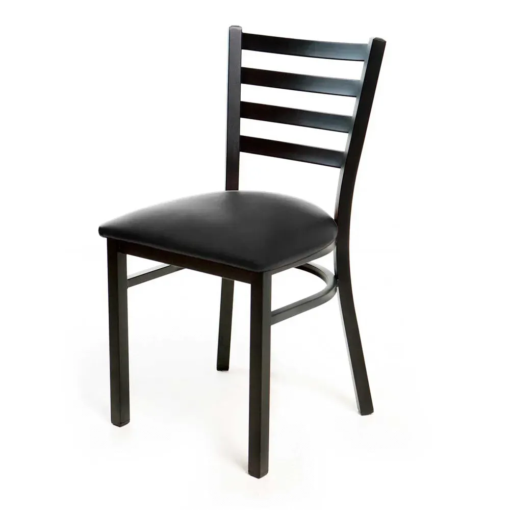 Experience kitchen innovation with the JustChair Manufacturing M20118-BLK-PS BVS-LOOSE Side Chair. This chair is designed to elevate the dining experience in commercial restaurants. With its ladder back design and upholstered padded seat, it offers both comfort and style. The welded 18 gauge steel frame with a textured black powder coat finish ensures durability and longevity, making it perfect for high-traffic areas. The black nylon glides protect your floors from scratches and scuffs. The chair comes with a black vinyl seat, adding a touch of elegance to any restaurant decor. The Quick Ship feature allows for easy and efficient delivery, ensuring that you can start using this chair in your restaurant right away. Whether you're running a bustling cafe or an upscale dining establishment, the JustChair Manufacturing M20118-BLK-PS BVS-LOOSE Side Chair is the perfect addition to your restaurant furniture collection.
