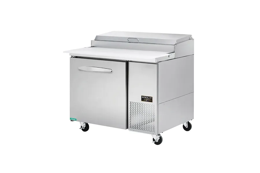 Enhance workflow with efficient tool through MVP's KPT-44-1 Refrigerated Counter, Pizza Prep Table. Designed specifically for commercial restaurant use, this one-section table offers a generous 11.3 cu. ft. capacity, providing ample space for all your pizza preparation needs. The 44-2/5"W x 36-1/2"D x 42" dimensions ensure it fits seamlessly into any kitchen layout. The raised pan rail with an insulated lid keeps ingredients fresh and easily accessible, while the included (6) 1/3 poly food pans and removable polyethylene cutting board offer convenience and versatility. The solid hinged door and two adjustable shelves provide additional storage options. Crafted with a stainless steel interior and exterior, this table is not only durable but also easy to clean. With automatic defrost and side-mounted self-contained refrigeration, maintaining the perfect temperature range of 33-40 degrees Fahrenheit is effortless. The KPT-44-1 is powered by a 1/4 HP motor and uses eco-friendly R290 refrigerant. Upgrade your restaurant's efficiency and productivity with MVP's KPT-44-1 Refrigerated Counter, Pizza Prep Table.