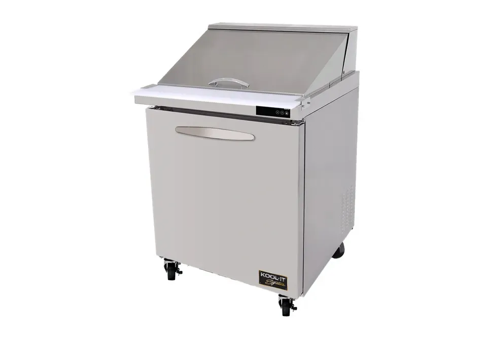 Upgrade operations with versatile options through the MVP KSTM-27-1 Refrigerated Counter, Mega Top Sandwich / Salad Unit. This one-section unit is designed to enhance efficiency in commercial restaurant settings. With a 7 cu. ft. capacity and a temperature range of 33-40 degrees, it provides ample space to store and prepare ingredients for sandwiches and salads. The unit features an insulated lid opening that can accommodate nine 1/6 size pans and three 1/9 size pans, with included 4" deep pans that can also accommodate 6" deep pans. The removable cutting board adds convenience and flexibility to food preparation. The solid hinged door and adjustable shelf offer additional storage options. Made with a stainless steel interior and exterior, this unit is durable and easy to clean. The rear-mounted self-contained refrigeration system and R290 refrigerant ensure optimal cooling performance. With its compact size and mobility provided by four 4" swivel casters, this MVP Refrigerated Counter is a must-have for any commercial restaurant looking to streamline operations.