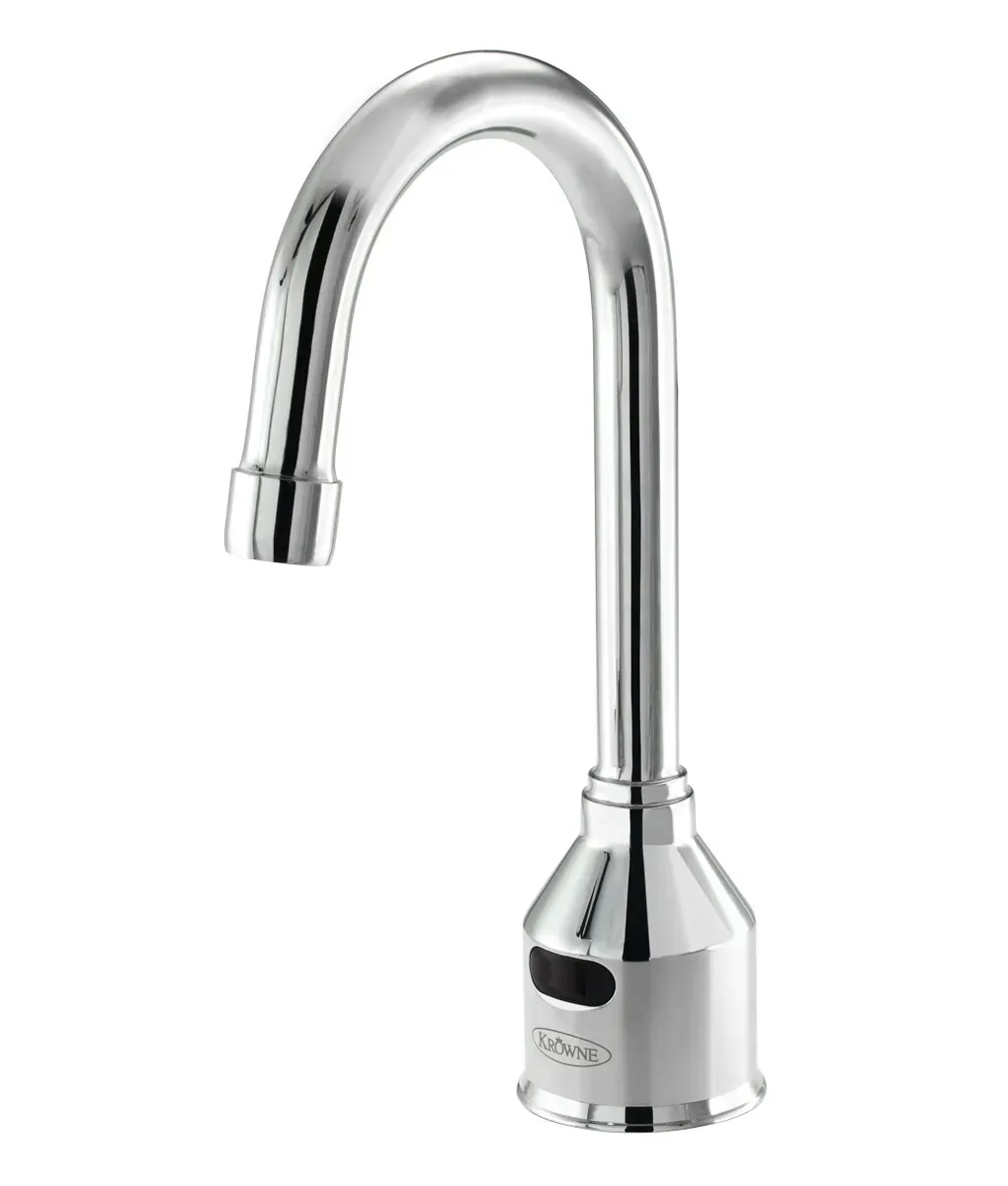 Introducing the Krowne Metal, 16-649, Electronic Faucet, designed to dominate the culinary world. This single hole deck mount sensor faucet is a game-changer for commercial restaurants. With its battery-operated, motion-sensing technology, this faucet ensures a hygienic and efficient handwashing experience for both staff and customers. The 4-1/2" rigid gooseneck spout provides ample clearance for filling large pots and pans, making it perfect for busy kitchen environments. The 1.50 GPM aerator ensures a steady flow of water while conserving water usage, saving costs in the long run. This electronic faucet is part of the Royal Series, known for its durability and reliability. Upgrade your kitchen with the Krowne Metal, 16-649, Electronic Faucet and experience the difference it makes in your culinary operations.