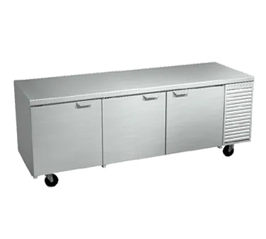 Transform operations with the La Rosa Refrigeration 2093-ST Refrigerated Counter Work Top. This three-section work table is designed to meet the demands of a commercial restaurant setting. With its 93" length and two removable shelves per door, it offers ample storage space for ingredients and supplies. The 16 gauge stainless steel flat top provides a durable and easy-to-clean surface for food preparation. The expansion valve system ensures precise temperature control, while the full finished welds and stainless steel construction guarantee long-lasting performance. The side-mounted refrigeration system maximizes interior space and allows for easy access to stored items. Equipped with casters, this self-contained unit can be easily moved for cleaning or rearranging. With a 1-year parts and labor warranty included, the La Rosa Refrigeration 2093-ST is a reliable and efficient solution for any commercial kitchen. MADE IN DETROIT.
