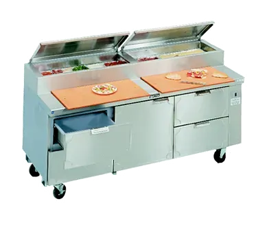 Revolutionize setup with a game-changing product. Introducing the La Rosa Refrigeration L-15148-32 Refrigerated Counter, Pizza Prep Table. Designed specifically for commercial restaurant use, this two-section table with doors is a must-have for any busy kitchen. The refrigerated raised rail can accommodate up to six 1/3 pans, allowing you to keep your ingredients fresh and easily accessible. The cold-wall rail construction with rail drain ensures efficient cooling and easy cleaning. With a full finished welds and a 16 gauge stainless top, front, and ends, this prep table is built to last. The stainless steel and plastic interior are both durable and hygienic. The adjustable feet and 8" stainless steel legs provide stability and flexibility. Made in Detroit, this prep table is a testament to quality craftsmanship. Upgrade your restaurant's efficiency and productivity with the La Rosa Refrigeration L-15148-32 Refrigerated Counter, Pizza Prep Table.
