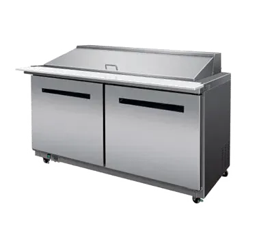 Modernize operations with intelligent choice using the Maxx Cold MXCR60MHC Refrigerated Counter, Mega Top Sandwich / Salad Unit. This two-section unit offers a spacious 15.5 cu. ft. storage capacity, perfect for commercial restaurant use. With two adjustable shelves and two hinged doors featuring recessed handles, organizing and accessing your ingredients has never been easier. The electronic thermostat and digital LED temperature display ensure precise temperature control, while the self-contained cooling system keeps your food fresh and ready to serve. The stainless steel exterior and painted aluminum interior provide durability and easy cleaning. The insulated top cover helps maintain optimal temperature levels, and the included cutting board and 24 polycarbonate pans offer convenient food preparation and storage. With its 1/2 HP rear-mounted compressor and caster wheels for mobility, this unit is both efficient and versatile. Trust Maxx Cold to deliver quality and efficiency to your restaurant kitchen.