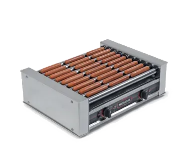 Elevate Your Culinary Setup with the Nemco, 8027, Hot Dog Grill. This Roll-A-Grill Hot Dog Grill is a must-have for any commercial restaurant. With its 10 chrome rollers and a capacity of 27 hot dogs, this grill can produce up to 540 hot dogs per hour, ensuring that you can keep up with high demand. The aluminum and stainless steel construction not only guarantees durability but also makes cleaning a breeze. Equipped with two 7-setting heat control switches and a powerful motor, you have full control over the cooking process. The 950-watt grill operates on 120v and 7.9 amps, meeting all safety standards. NSF and cETLus certified, this grill is a reliable and authentic addition to your kitchen. Don't miss out on this essential tool for serving delicious hot dogs to your customers.
