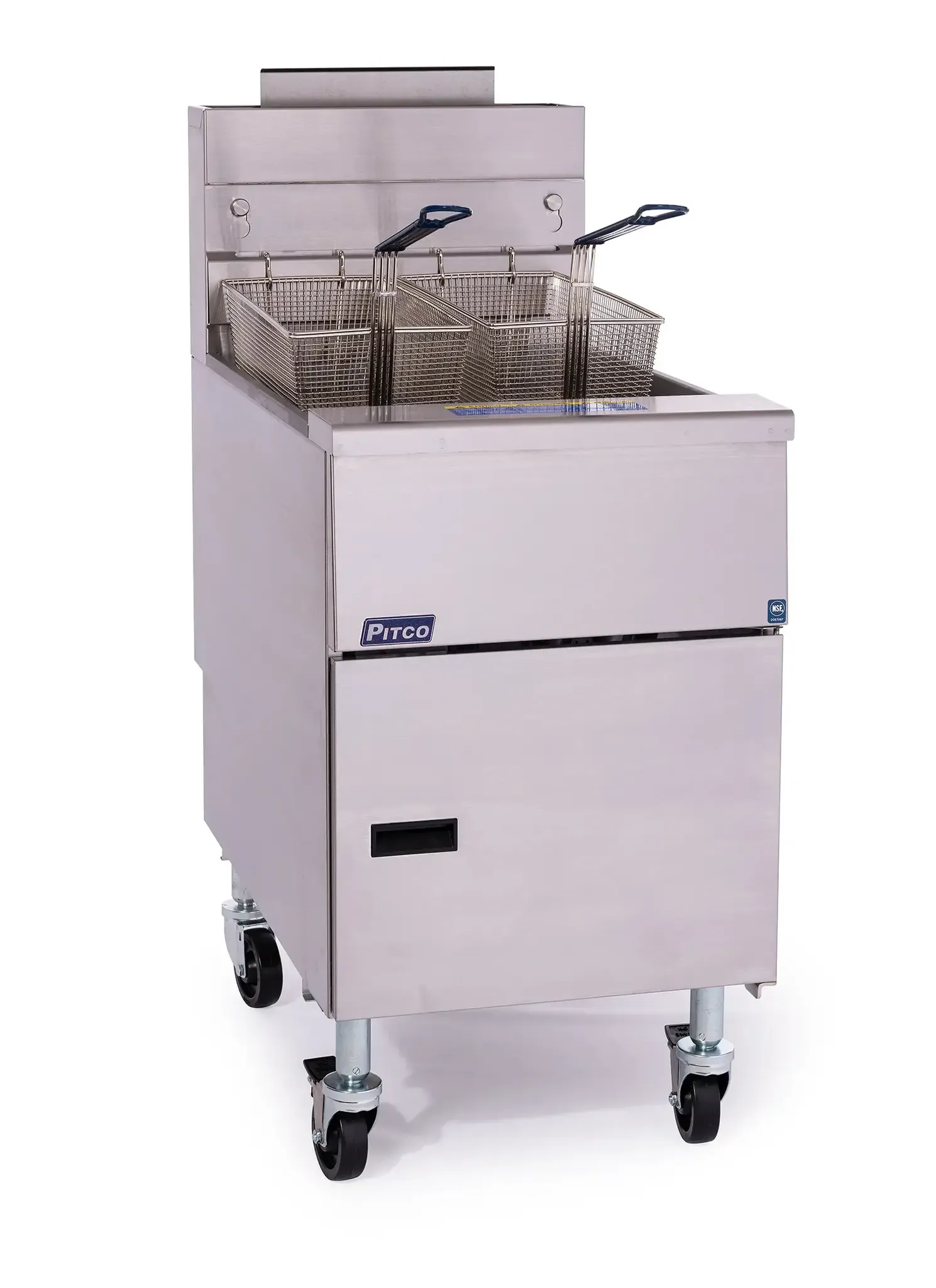 Cook with precision using the Pitco Frialator VF-35S Gas Fryer. This floor model fryer is designed for commercial restaurant use, offering a generous 35 lb. oil capacity and a powerful 70000 BTU gas burner. With its millivolt control and removable basket hanger, you can easily adjust the temperature and remove the baskets for convenient frying. The fryer comes with two twin baskets, allowing you to fry multiple items simultaneously. Its stainless steel tank, front, door, and sides ensure durability and easy cleaning. The fryer is ENERGY STAR certified, ensuring energy efficiency and cost savings. It is also CSA Flame, CSA Star, NSF, and CE certified, meeting the highest safety and quality standards. With its 9" adjustable legs, you can easily position the fryer at the perfect height for your kitchen. Upgrade your restaurant's frying capabilities with the Pitco Frialator VF-35S Gas Fryer.