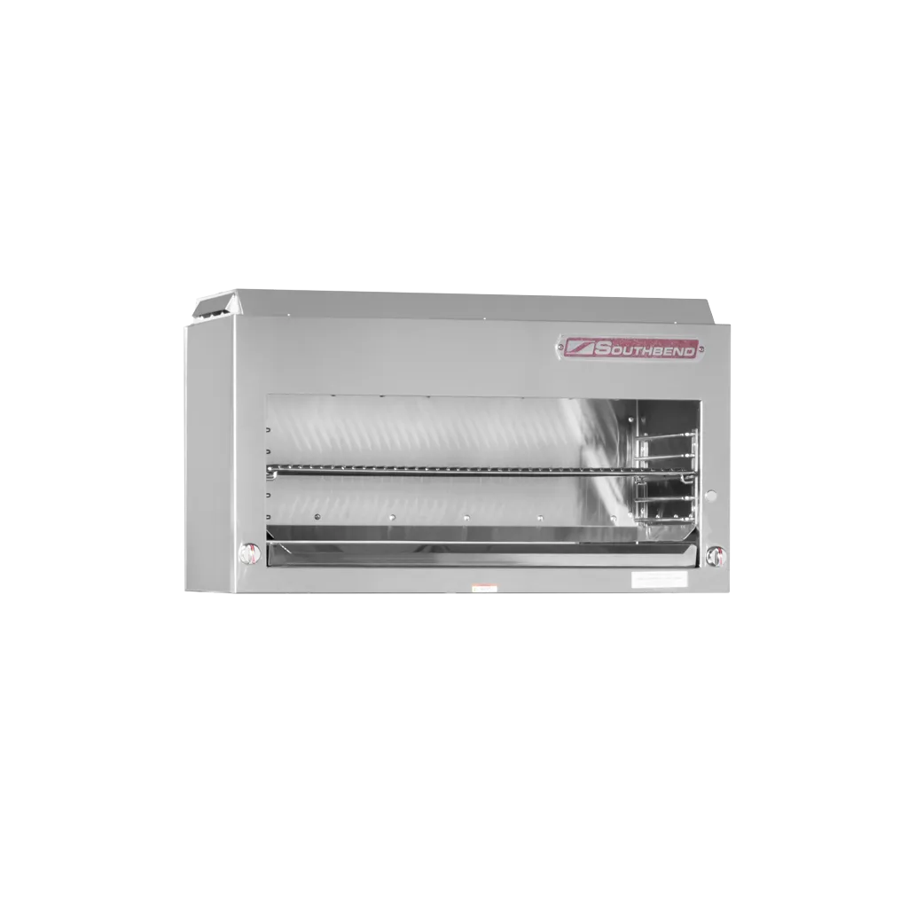 Create culinary magic with the Southbend P72-CM Gas Cheesemelter. This platinum heavy-duty cheesemelter is designed to meet the demands of a commercial restaurant kitchen. With its 72" size and riser mount, it provides ample space and easy installation. The cheesemelter features four infrared burners that ensure even heating and perfect melting every time. The five-position rack guides and chrome-plated rack allow for versatile cooking options and easy adjustment. The dual valve control gives you precise temperature control, while the 90-second preheat time ensures quick and efficient operation. The removable crumb tray makes cleaning a breeze, and the stainless steel construction guarantees durability and longevity. With 80,000 BTU of power, this cheesemelter is CSA and NSF certified, making it a reliable and safe choice for any commercial kitchen. Elevate your culinary creations with the Southbend P72-CM Gas Cheesemelter.